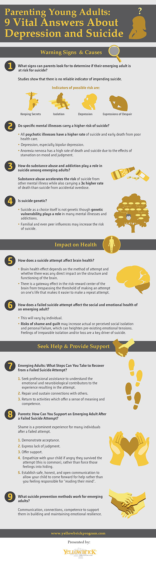 While no parent wants to believe that their child would ever consider taking their own life, suicide is actually the third leading cause of death for young people between the ages of 10 and 24, according to the CDC. It’s vital for parents of young adults to understand and recognize the warning signs of depression, the potential health impact of a suicide attempt, and how to seek help if their child is having suicidal thoughts. That’s why Yellowbrick, a Chicago-based treatment center for troubled emerging adults, has put together an infographic highlighting some of the key things parents need to know about depression and suicide. Learn some of the key facts and view the original graphic below.